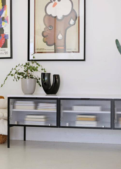 Szafka telewizyjna WAVY z ryflowanym szkłem, dwie wysokości blatu.