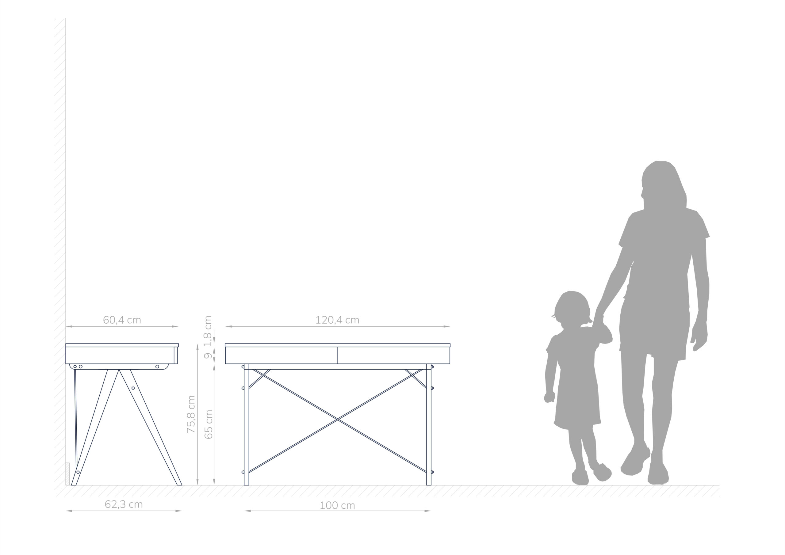 Biurko jest wyposażone w dwie szuflady, otwierane za pomocą podcięcia na palce pod blatem.