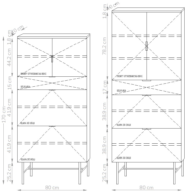 Szafka ma dwa fronty rozwierne za którymi znajdują się dwie półki z możliwością regulacji wysokości.