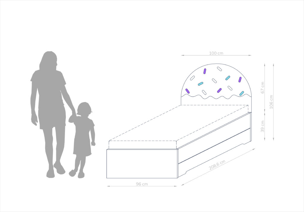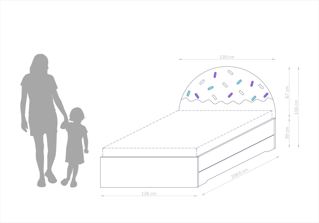Łóżko ma tapicerowaną skrzynię i zagłówek w kształcie słodkiego deseru z posypką CONFETTI.