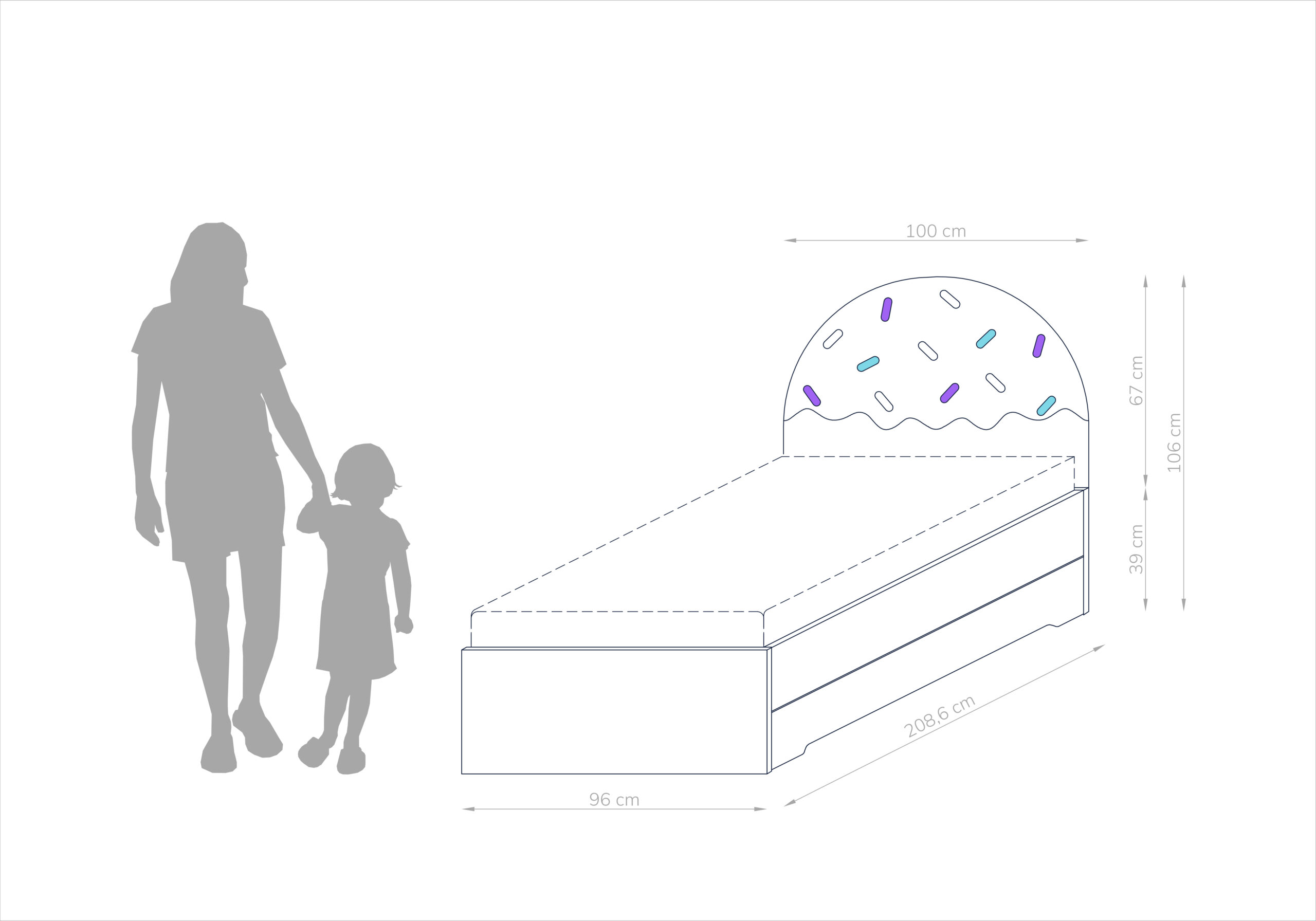 Łóżko ma tapicerowaną skrzynię i zagłówek w kształcie słodkiego deseru z posypką CONFETTI.