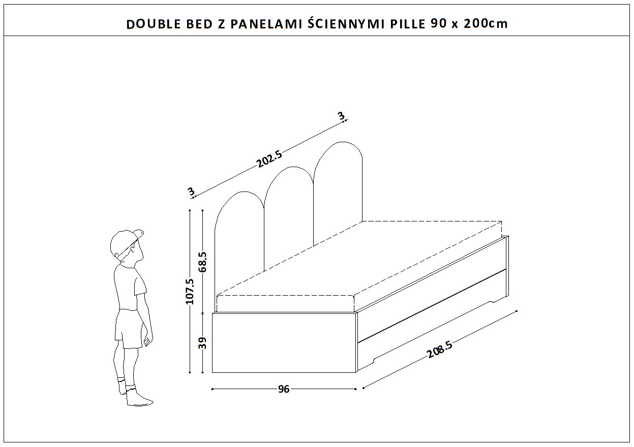 Tapicerowane łóżko z dużym pojemnikiem na pościel lub miejscem na dodatkowy materac, ozdobione zestawem trzech paneli ściennych PILLE w wybranym przez Ciebie kolorze.