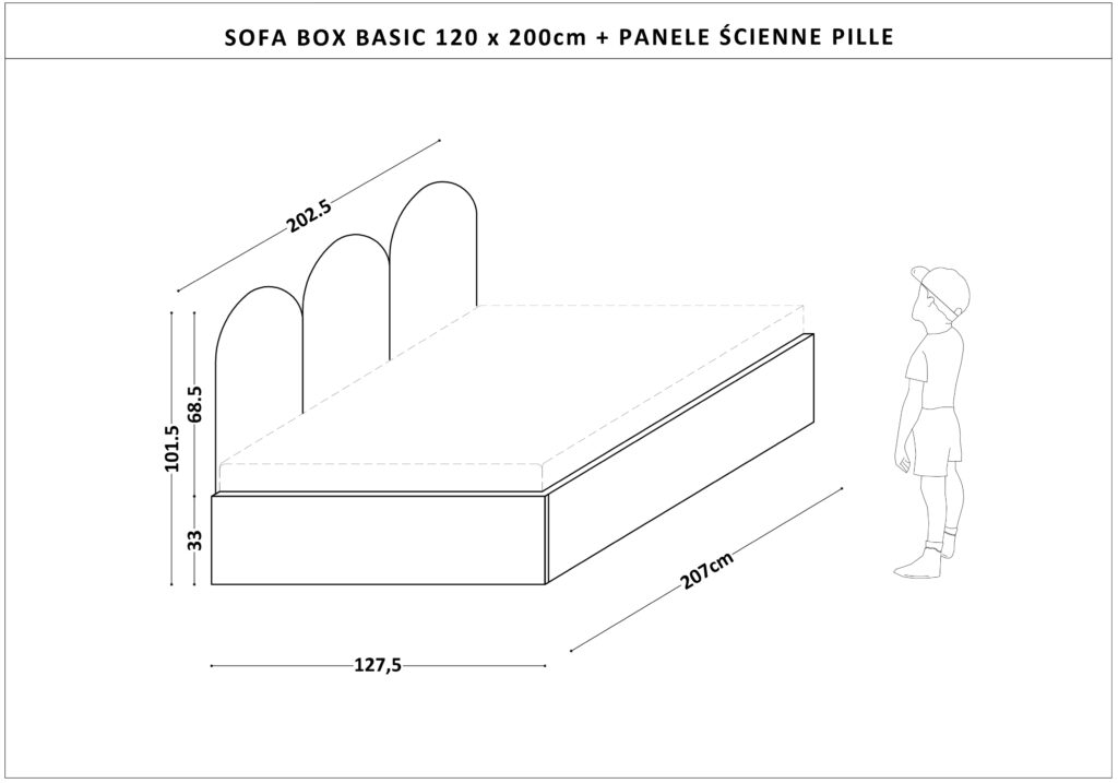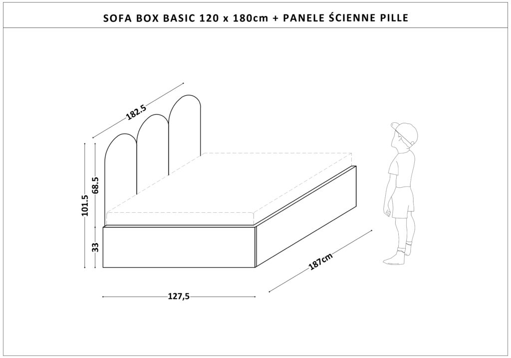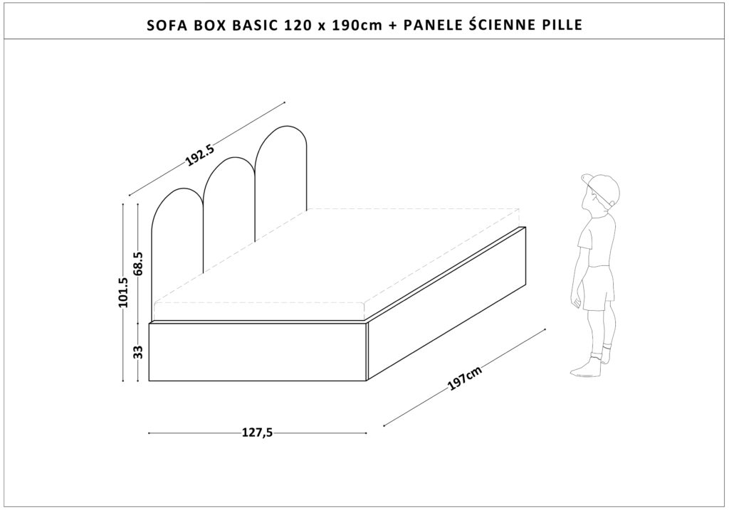 Łóżko ma tapicerowane panele ścienne i pojemną skrzynię na pościel lub zabawki, w kolorze z naszej palety BASIC.