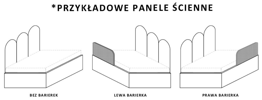 Boczki są standardowo w kolorze ramy łóżka, a ich położenie w konfiguratorze (“prawy” czy “lewy”) określa się “stojąc przodem” do zagłówka.
