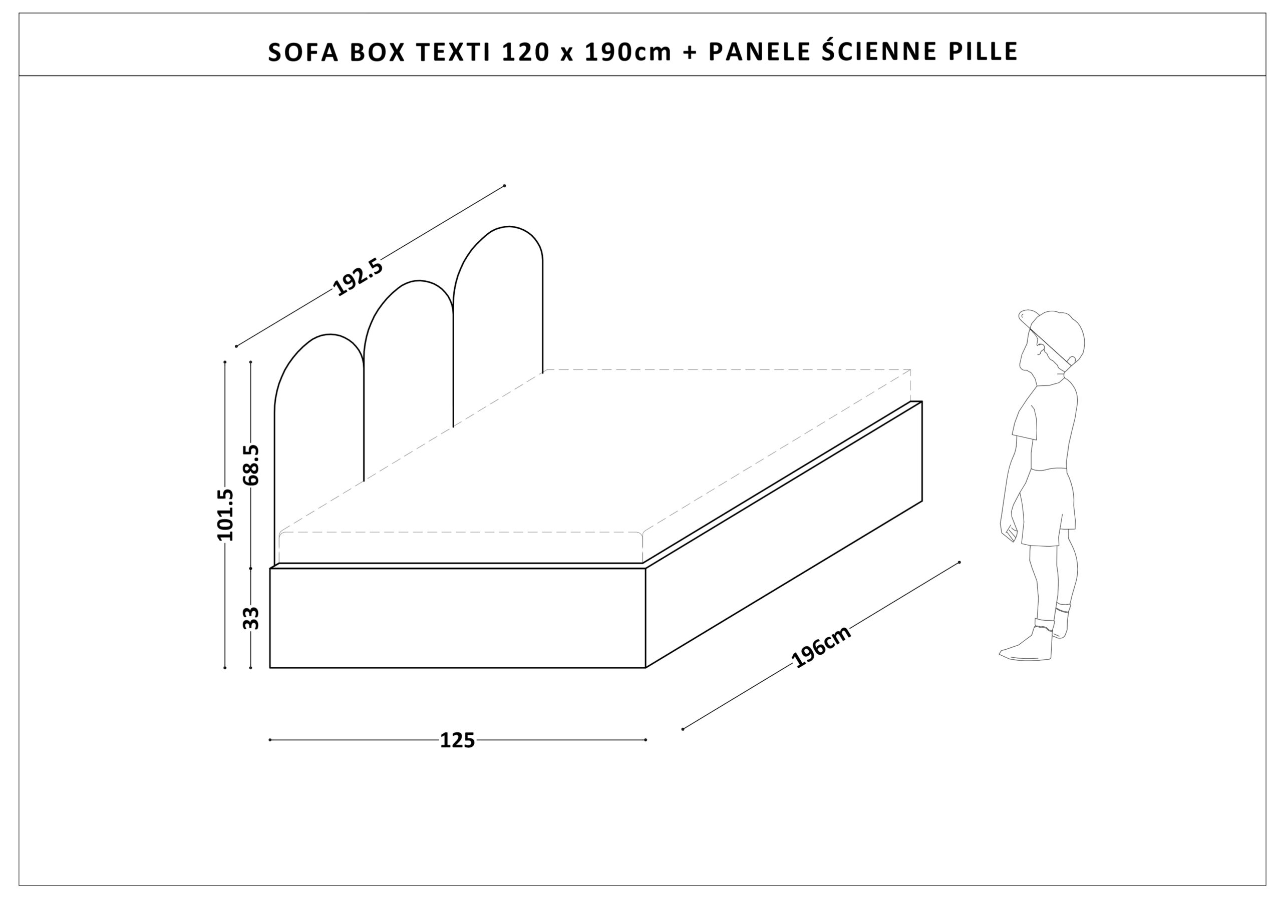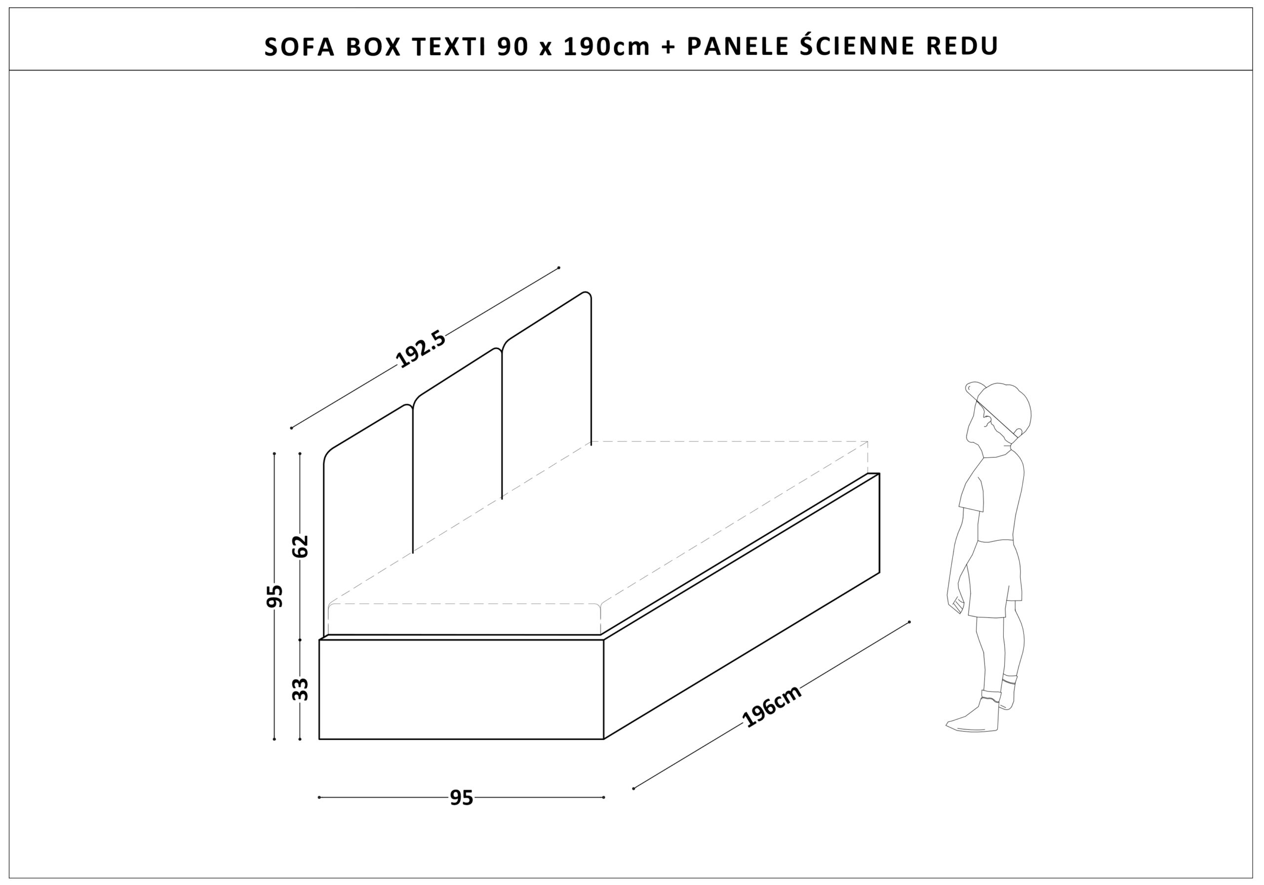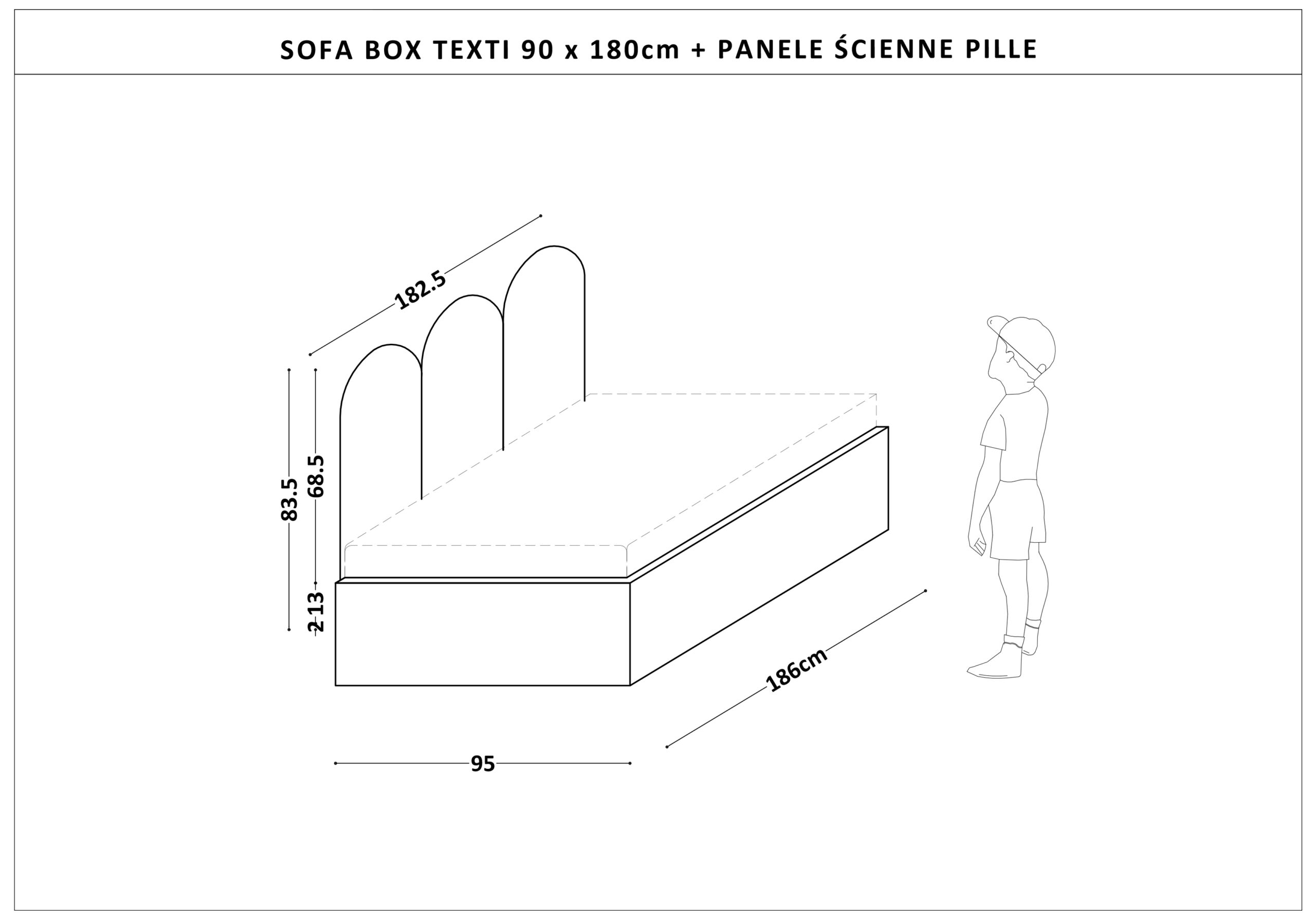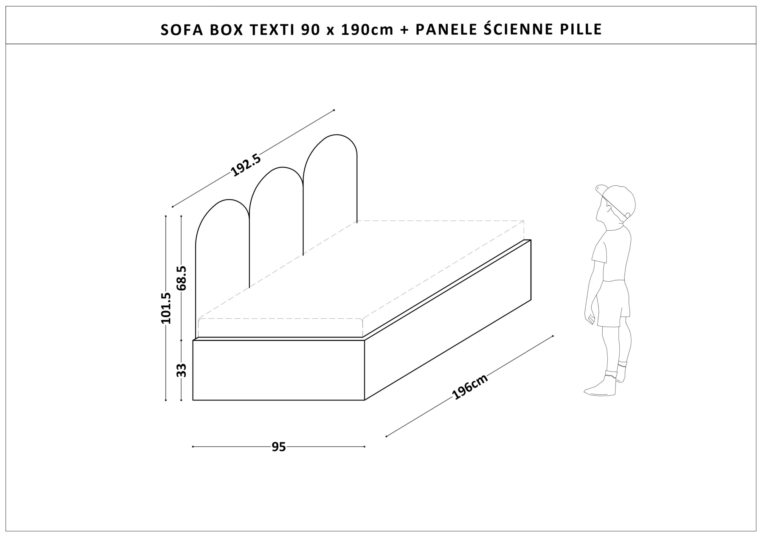 Młodzieżowe łóżko Sofa Box Texti z półokrągłymi lub prostokątnymi panelami ściennymi w typie dziennej sofy plus ogromny pojemnik do przechowywania pod materacem.