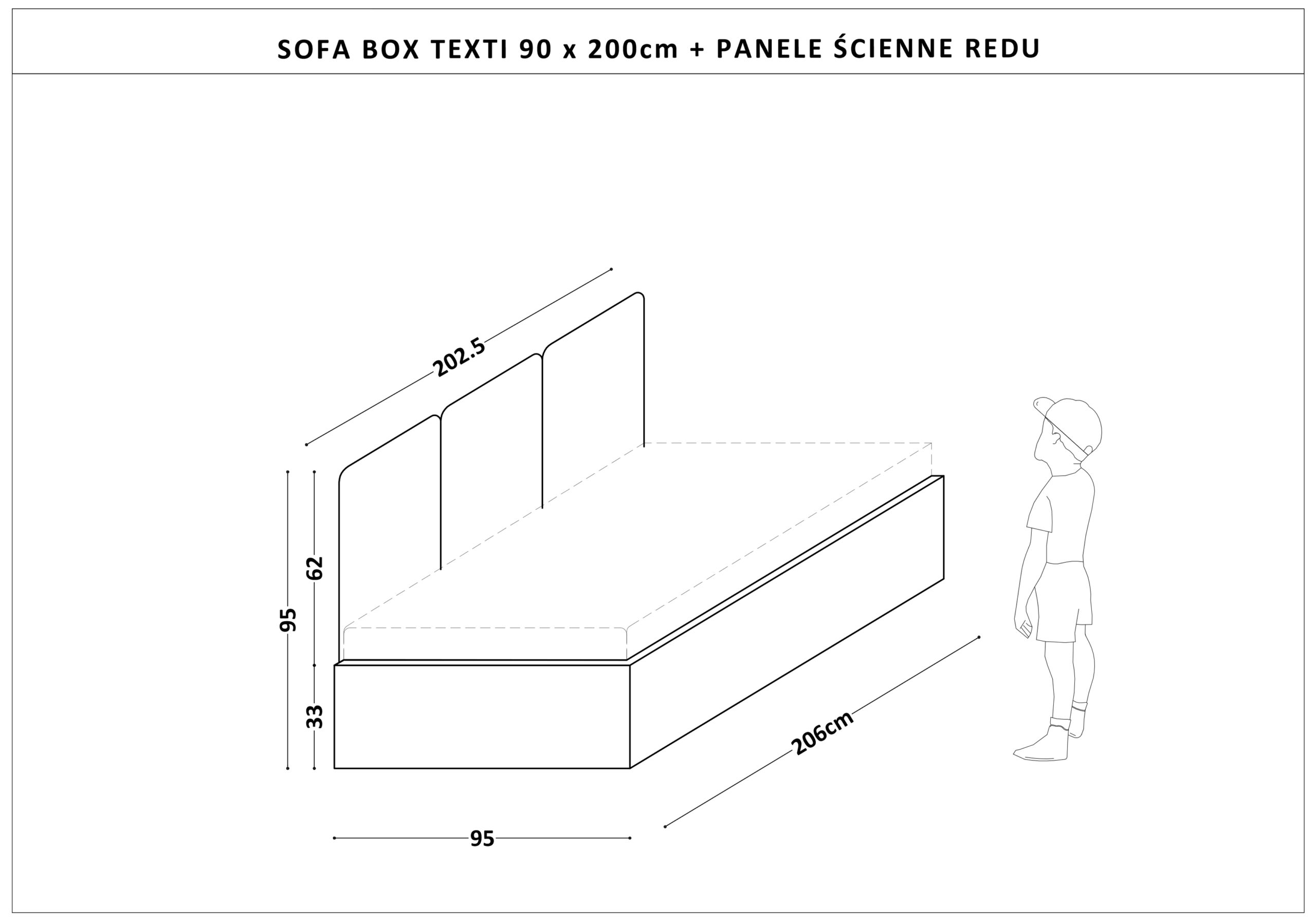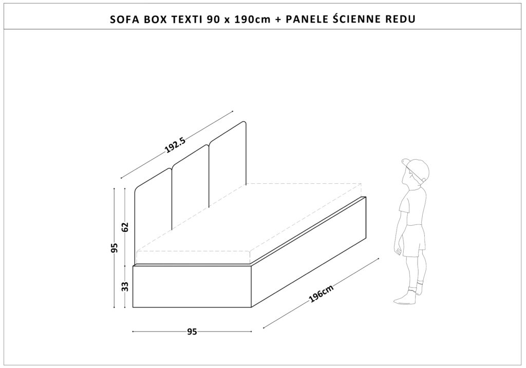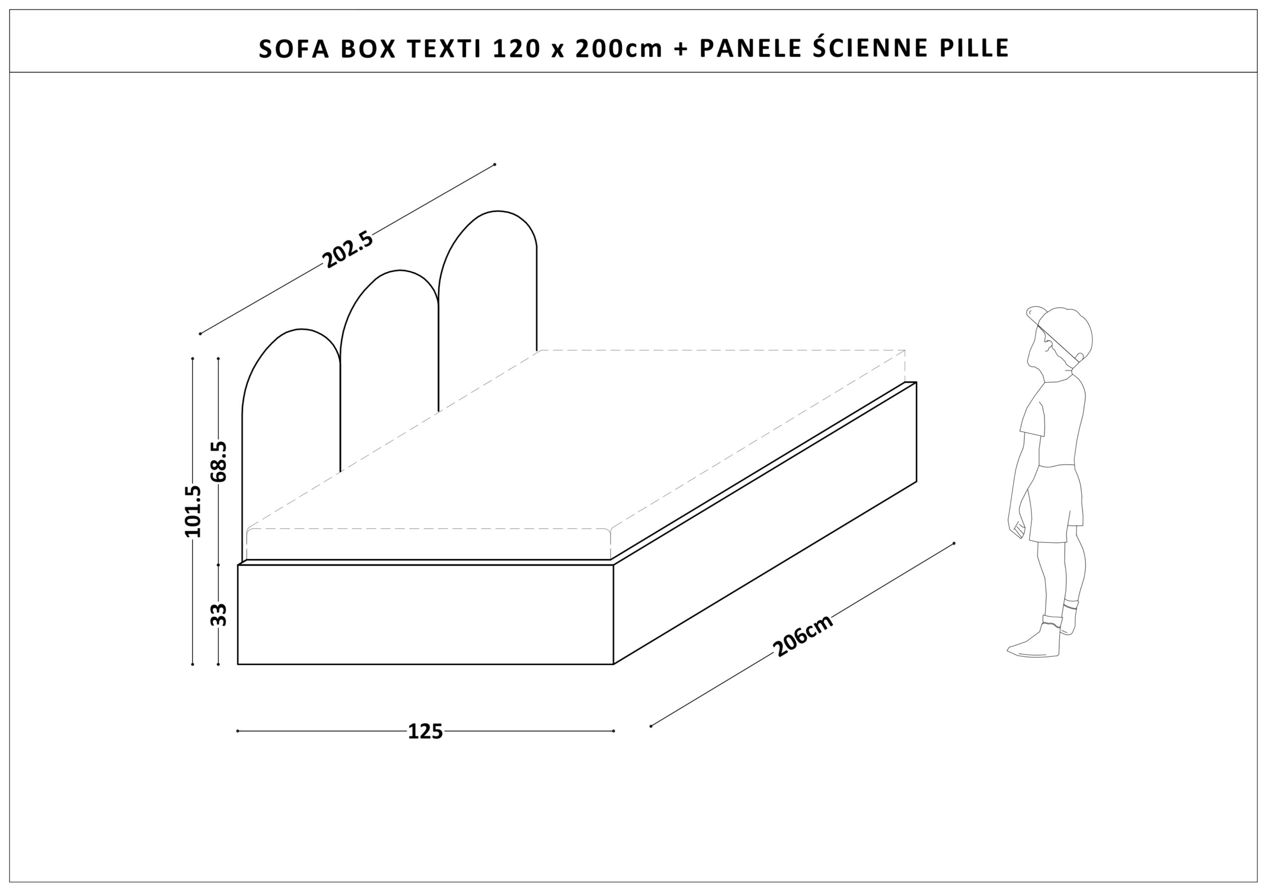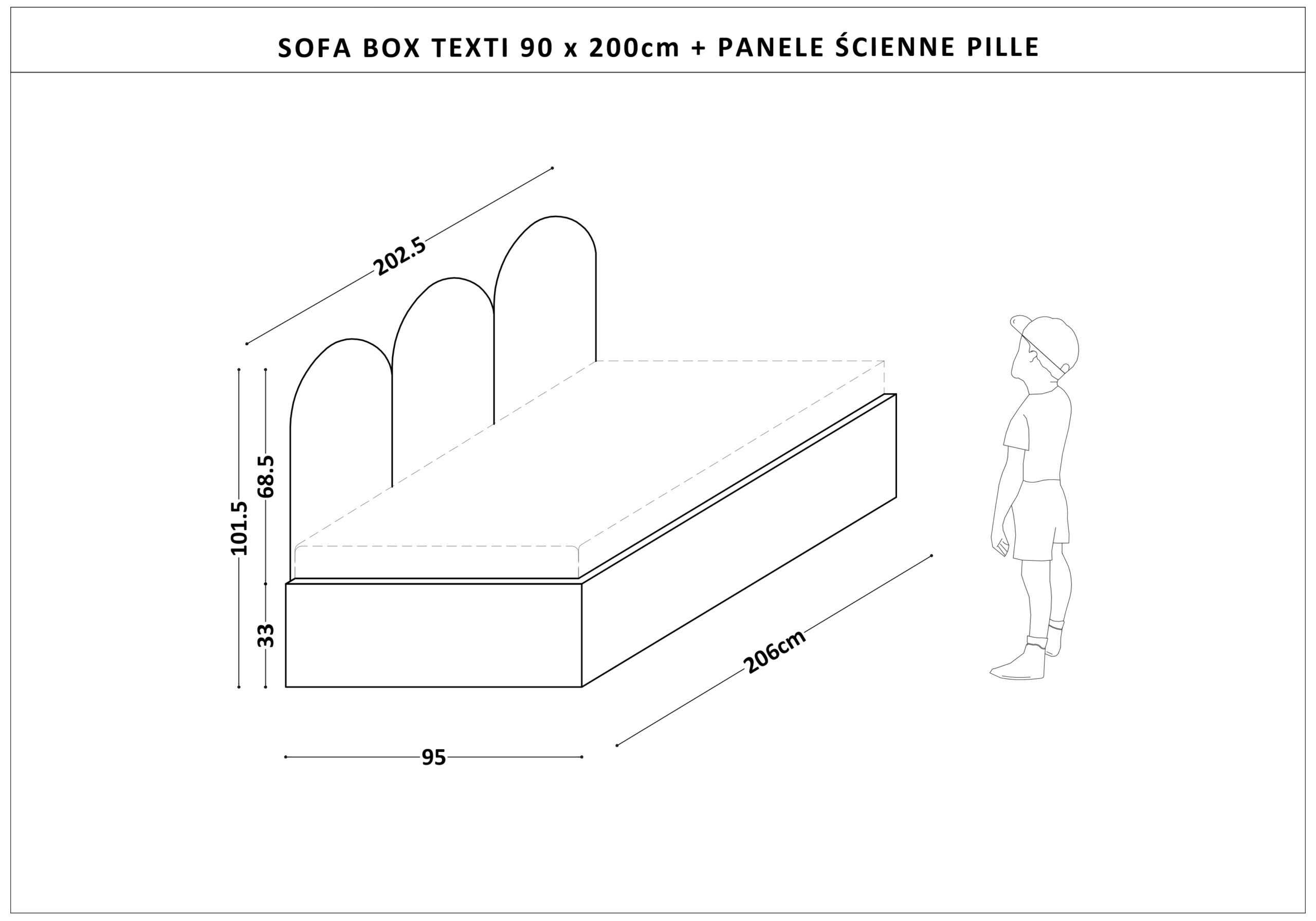Młodzieżowe łóżko Sofa Box Texti z półokrągłymi lub prostokątnymi panelami ściennymi w typie dziennej sofy plus ogromny pojemnik do przechowywania pod materacem.