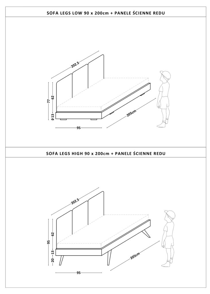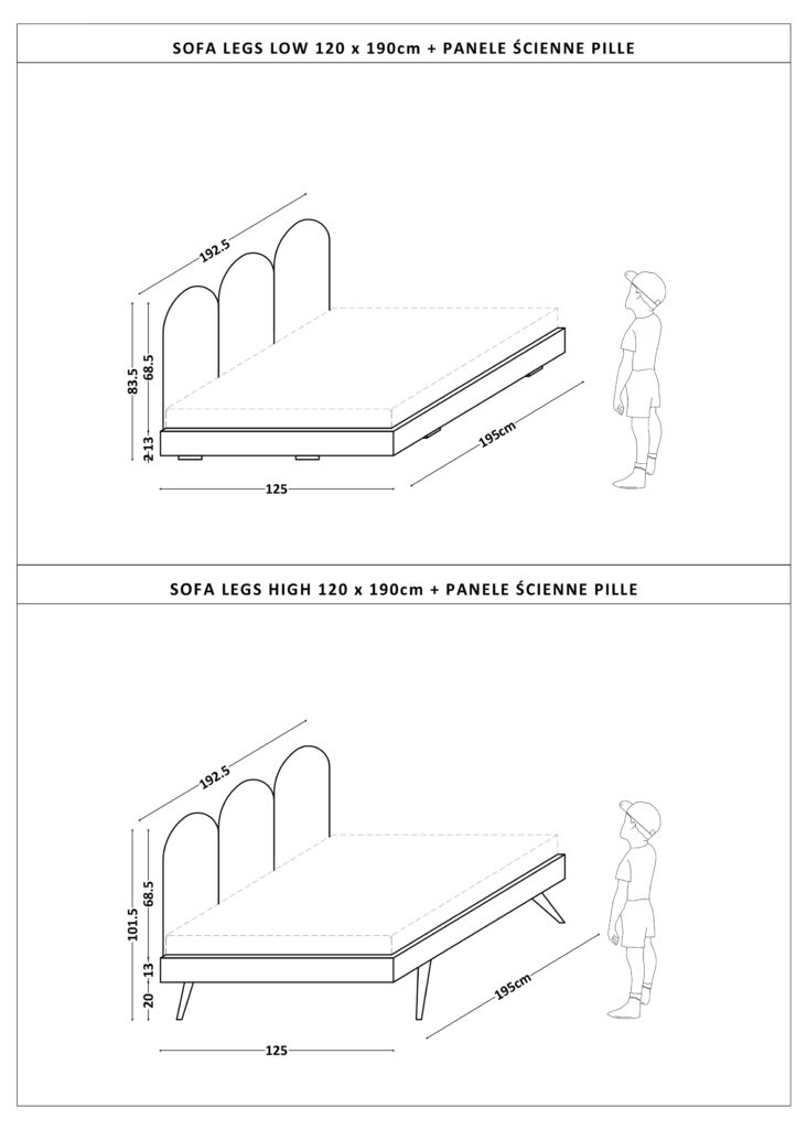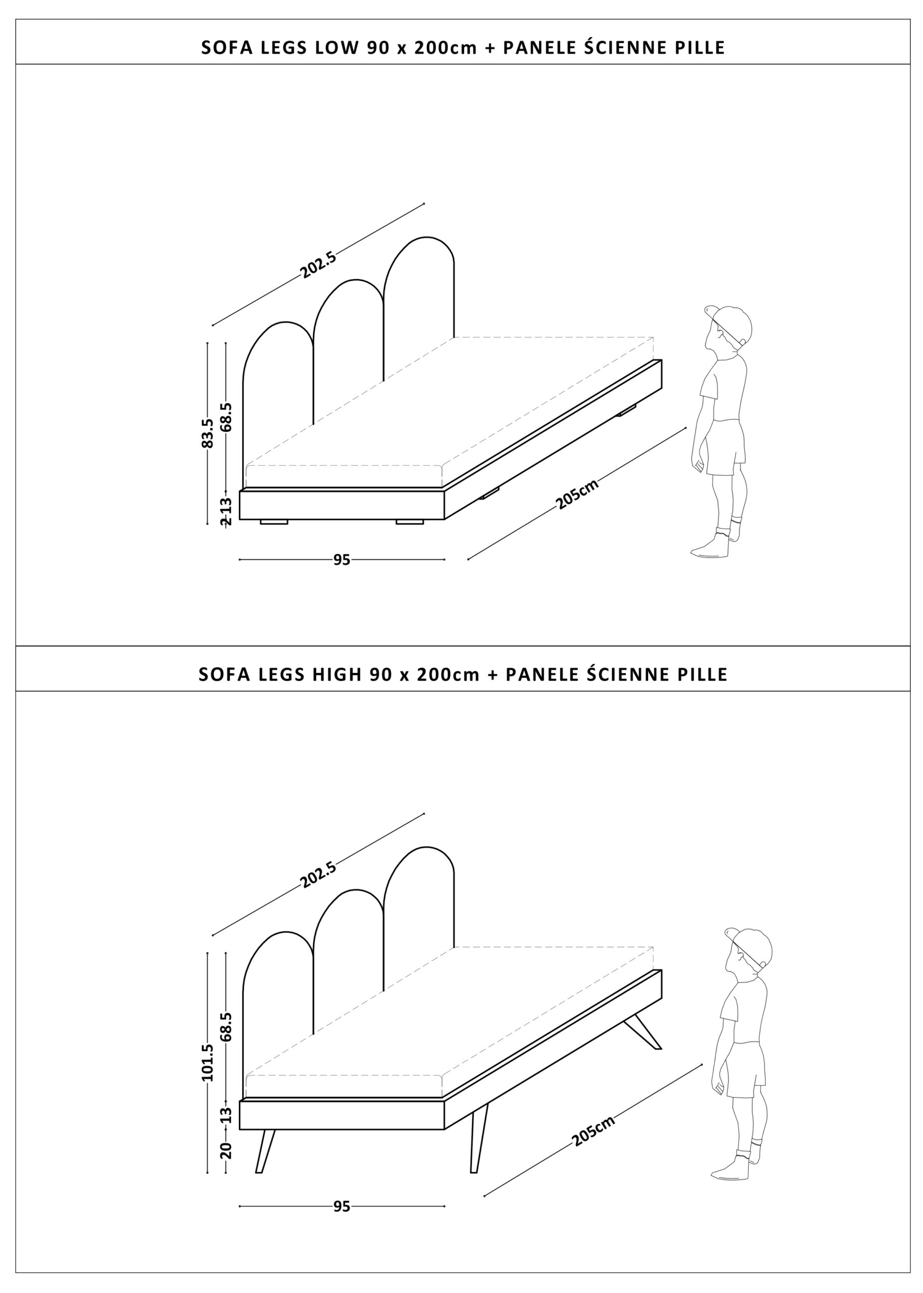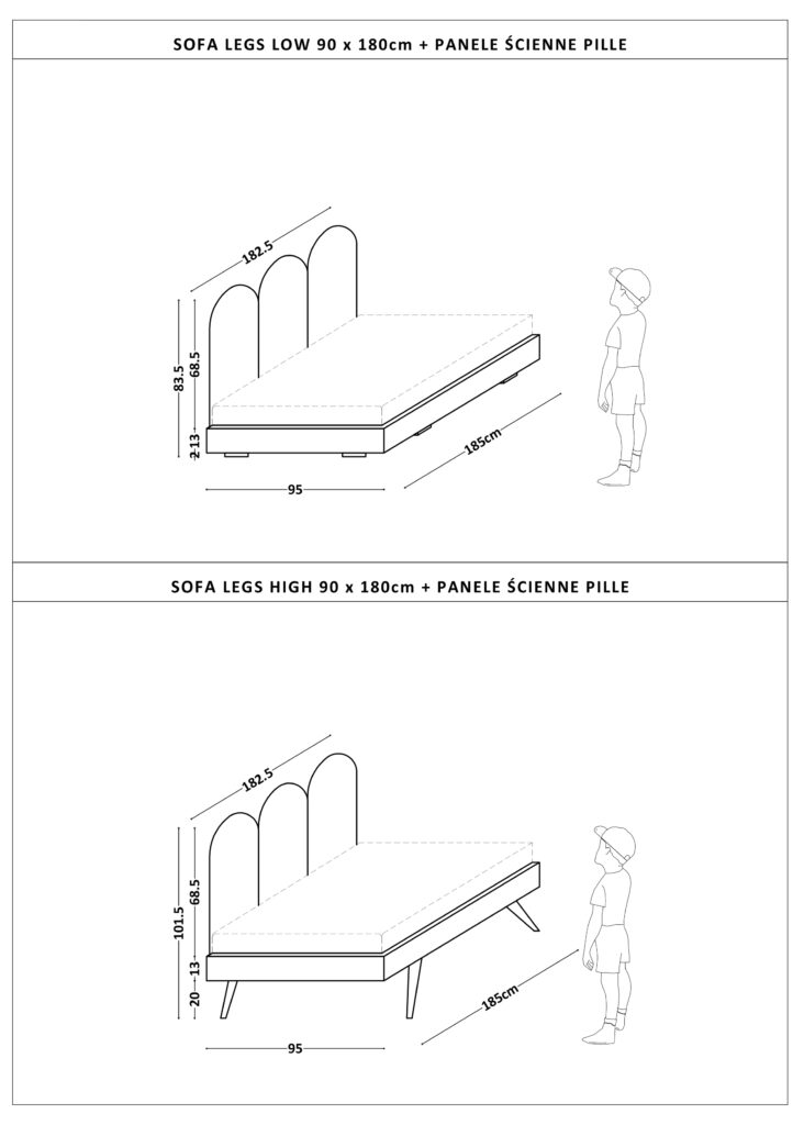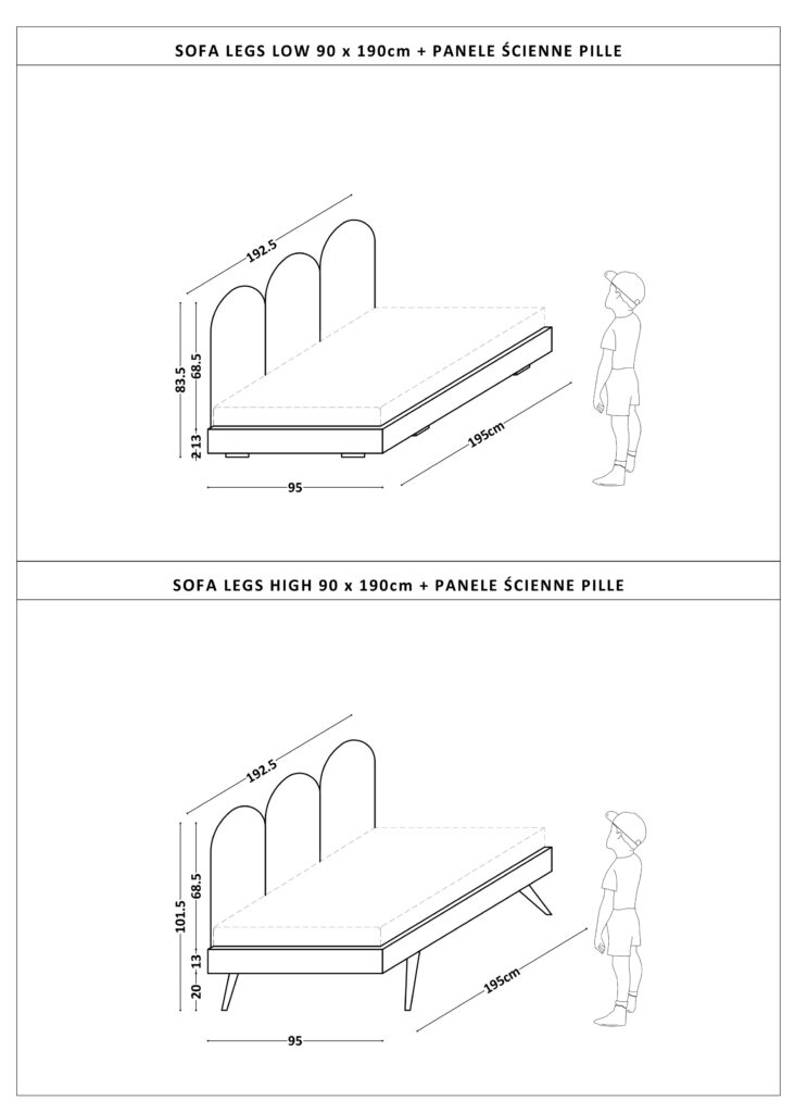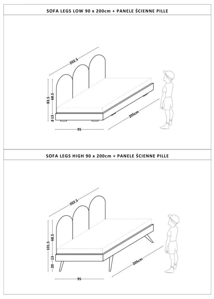 Dziecięce łóżko Sofa Legs Texti z półokrągłymi lub prostokątnymi panelami ściennymi w typie dziennej sofy to piękny mebel z manufaktury Minko, który pozwoli Twojemu dziecku komfortowo odpocząć, a we wnętrzu sypialni wprowadzi przytulny, skandynawski klimat.