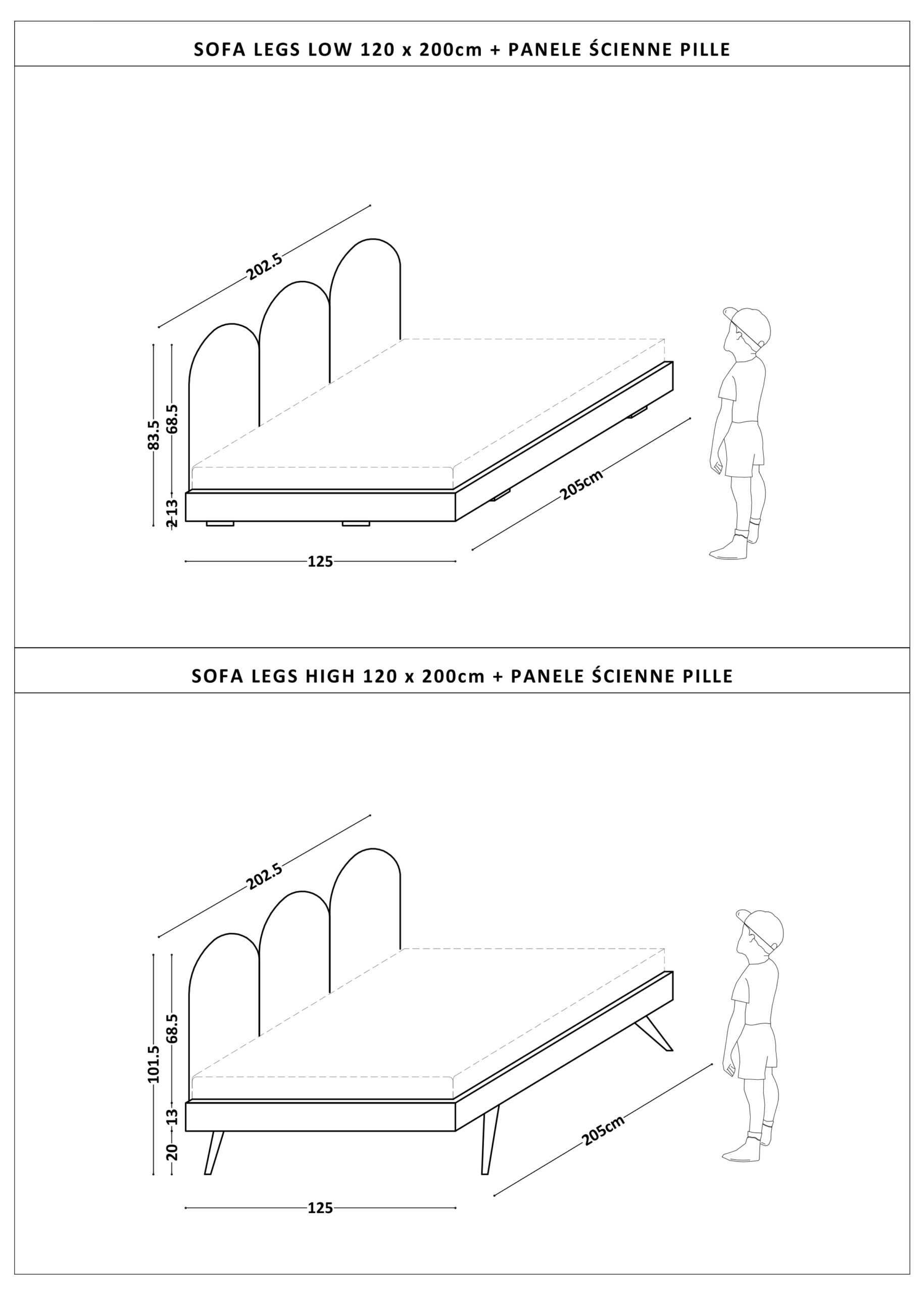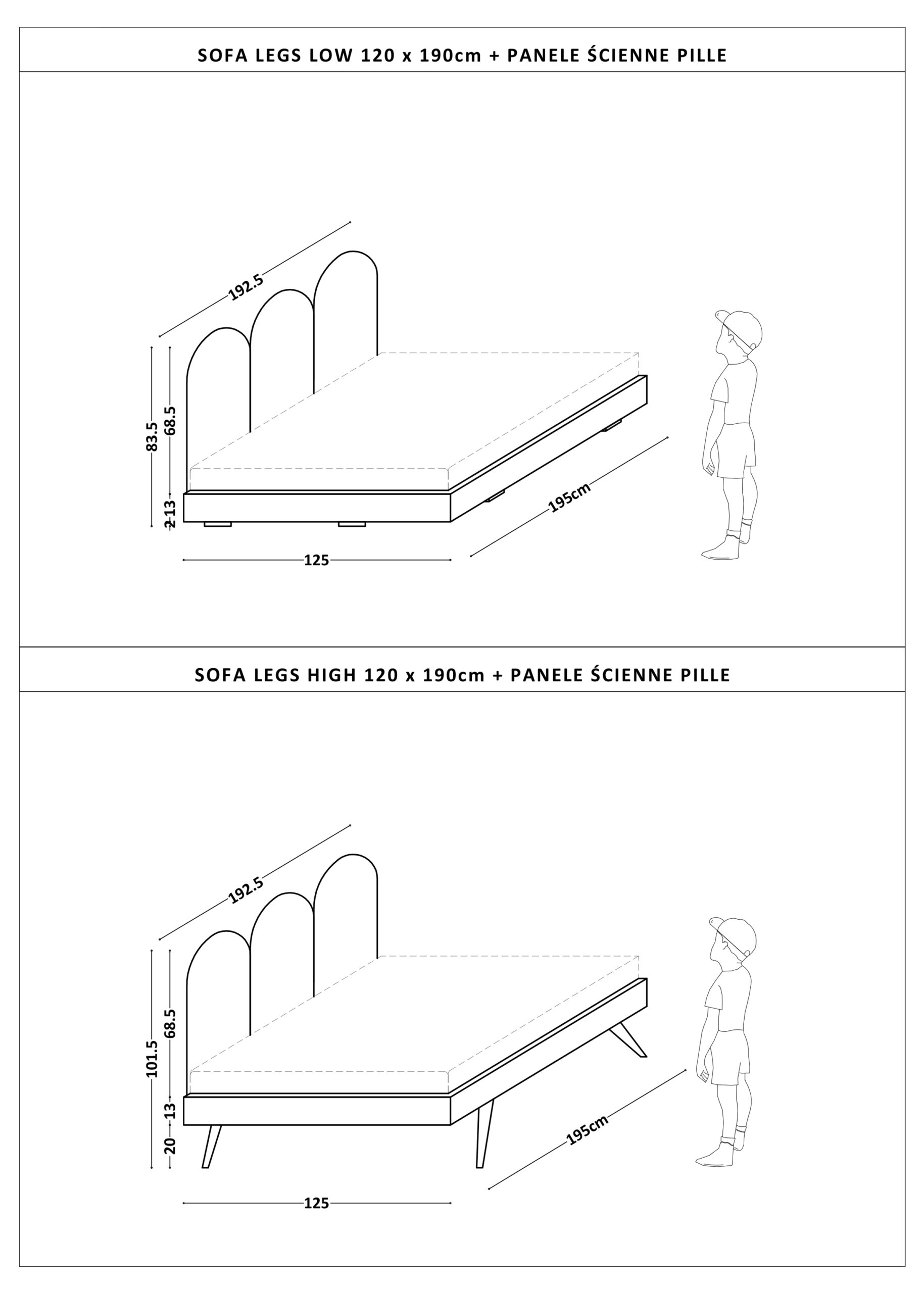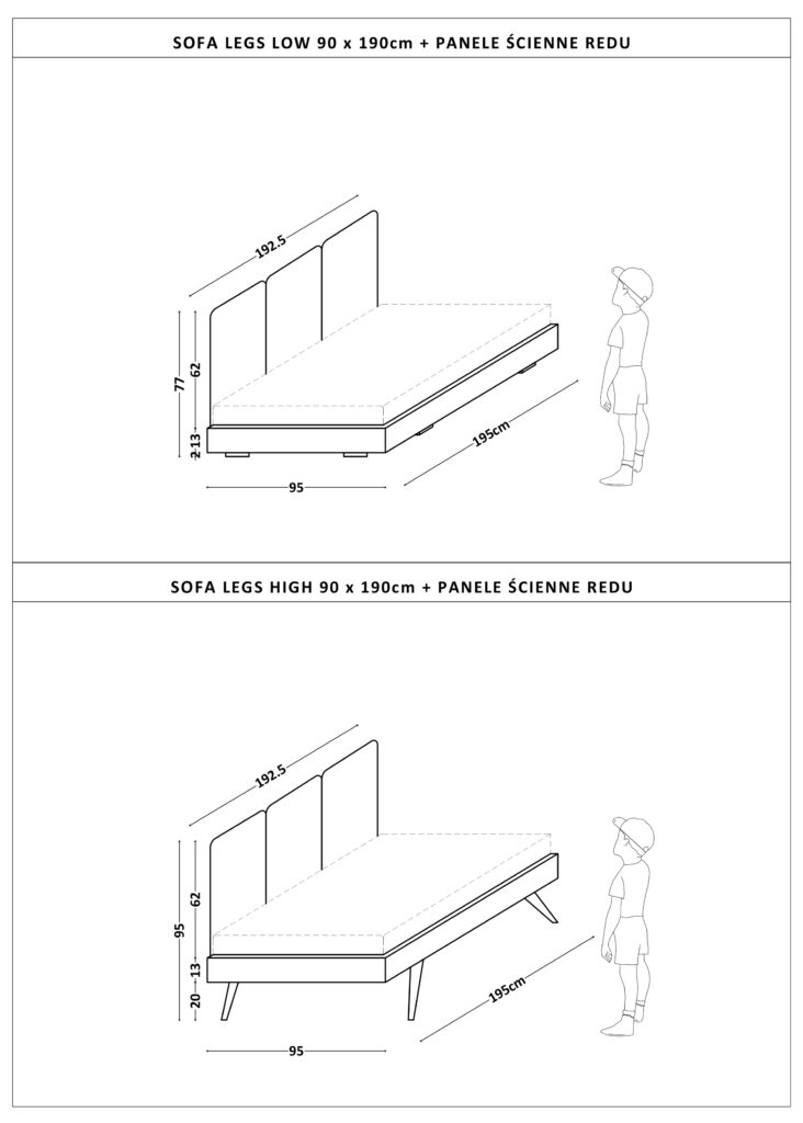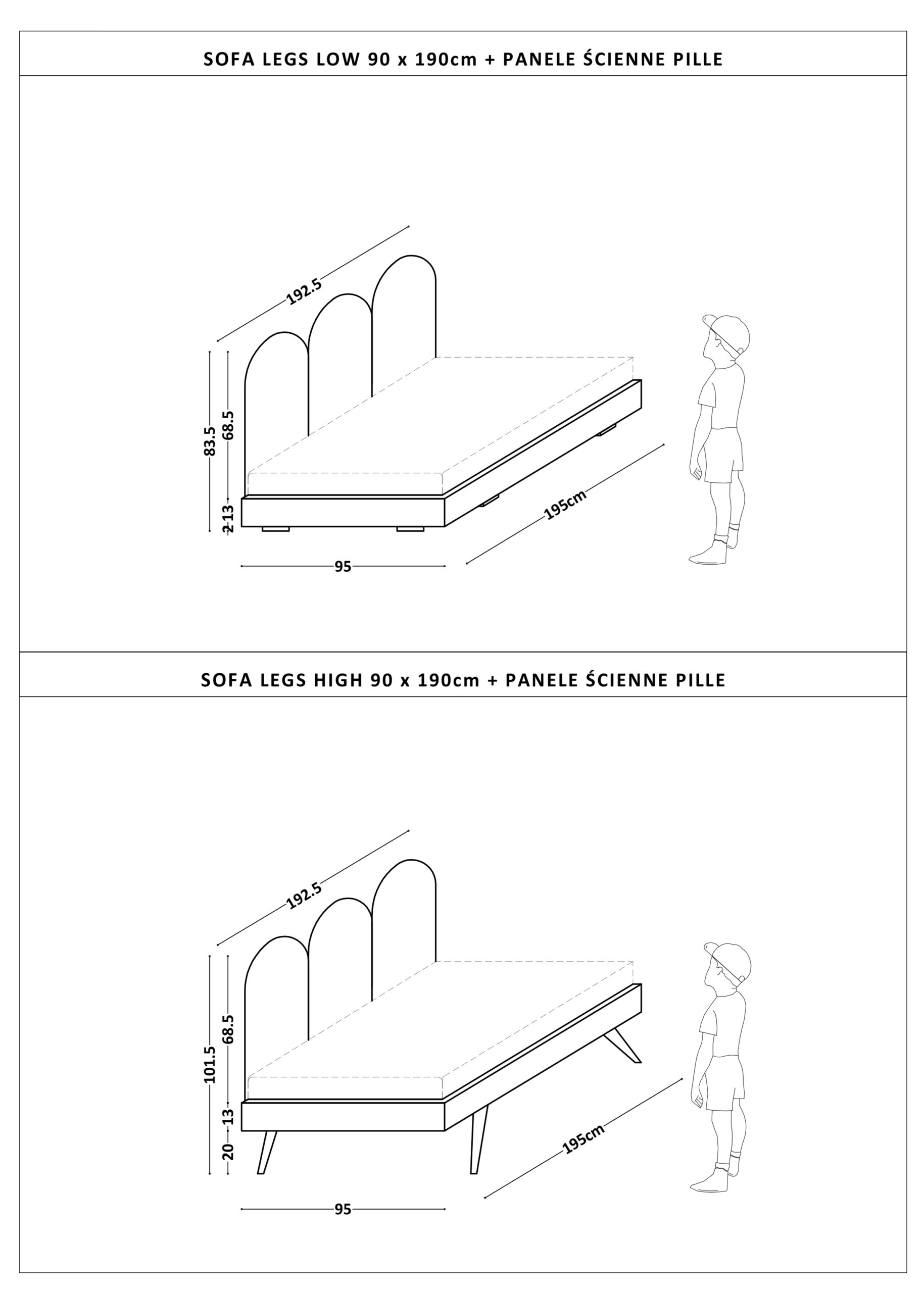 Dziecięce łóżko Sofa Legs Texti z półokrągłymi lub prostokątnymi panelami ściennymi w typie dziennej sofy to piękny mebel z manufaktury Minko, który pozwoli Twojemu dziecku komfortowo odpocząć, a we wnętrzu sypialni wprowadzi przytulny, skandynawski klimat.