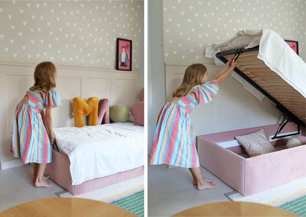 Rama łóżka (skrzynia) skrywa pod stelażem ogromny pojemnik na pościel, kołdry, walizki i inne przedmioty: