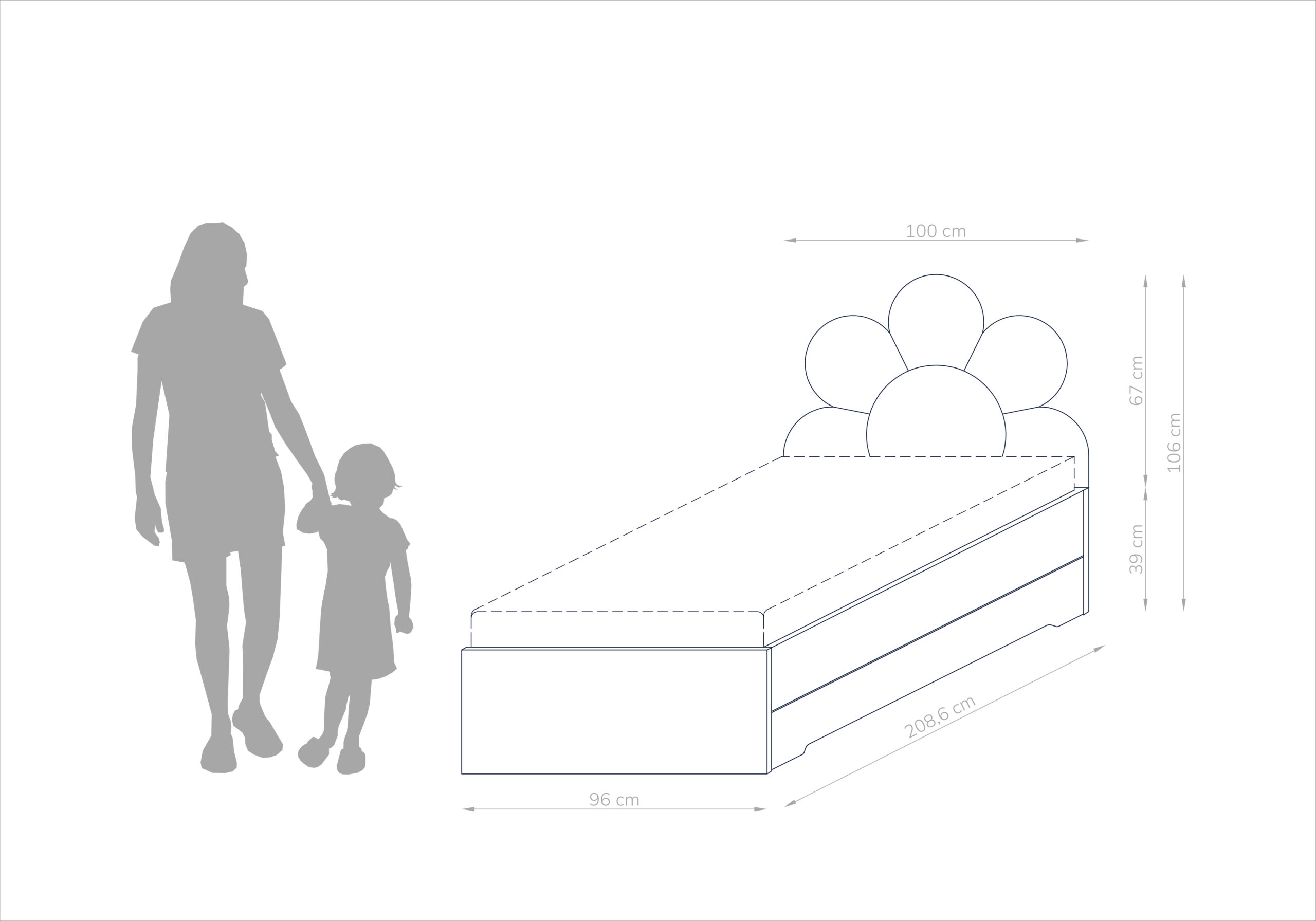 Łóżko ma tapicerowaną skrzynię i zagłówek w kształcie STOKROTKI.