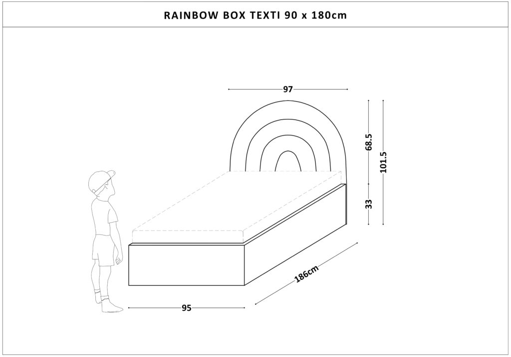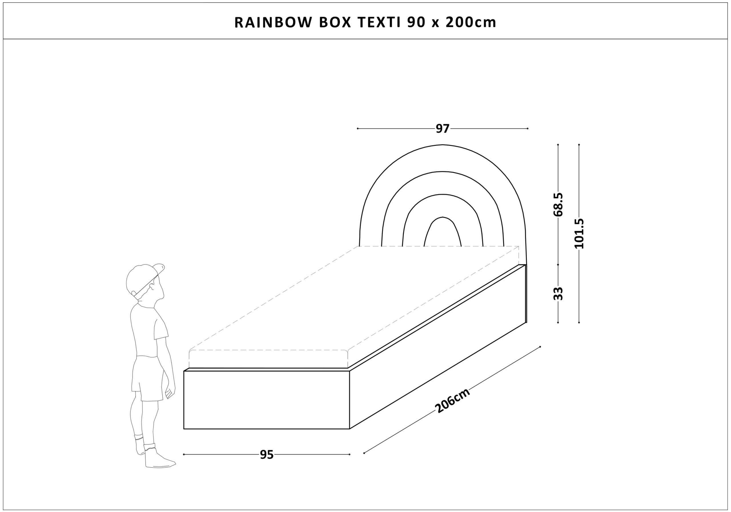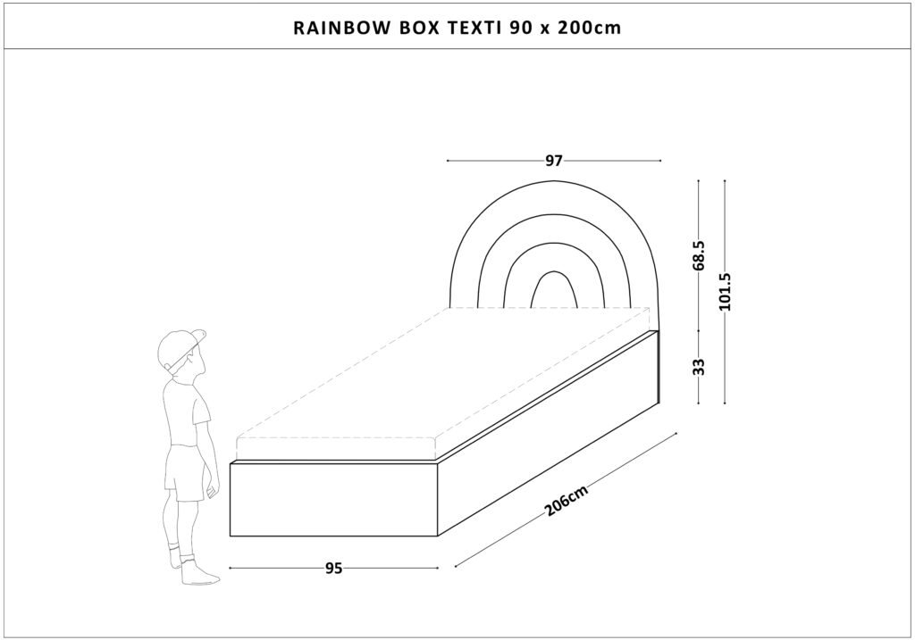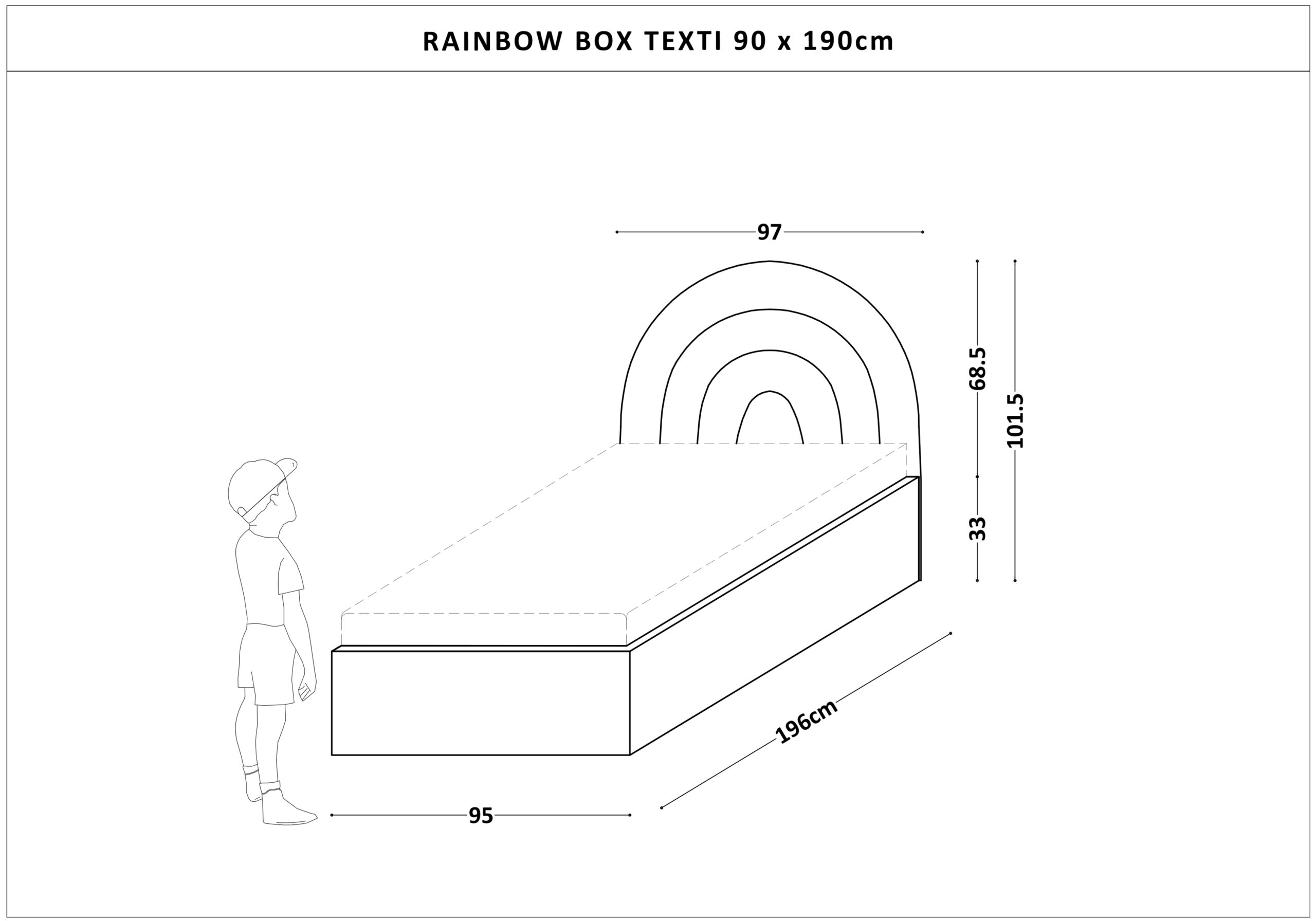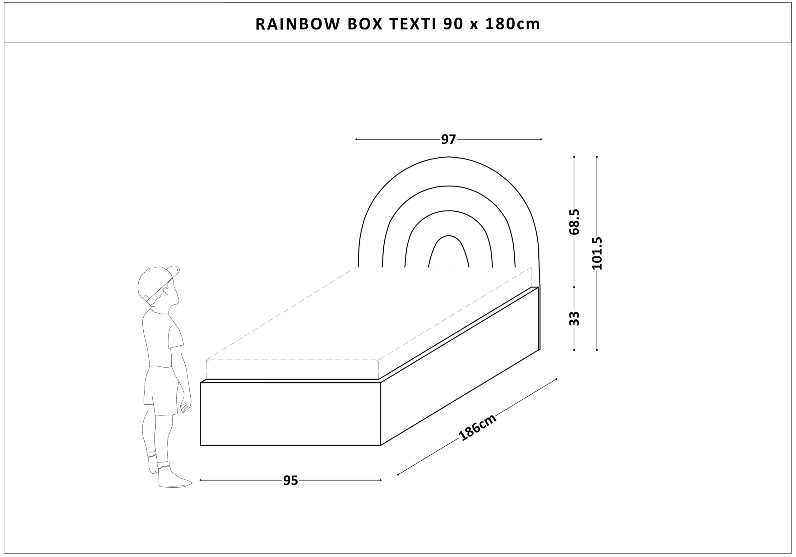 Łóżko dziecięce Rainbow Box Texti wyposażone zostało w otwierany do góry, tapicerowany pojemnik na pościel. To sprytne rozwiązanie pozwoli Ci na przechowywanie nie tylko pościeli, ale także zabawek, sezonowych ubrań czy innych dziecięcych skarbów. Skrzynia łóżka jest otapicerowana takim samym materiałem, który otacza ostatni, skrajny łuk zagłówka “tęczy”.