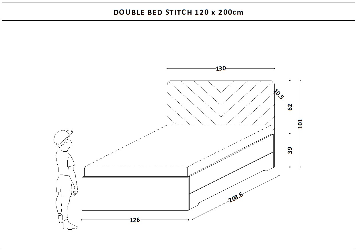 Łóżko ma tapicerowaną skrzynię i zagłówek w kształcie PROSTOKĄTA Z PRZESZYCIAMI.