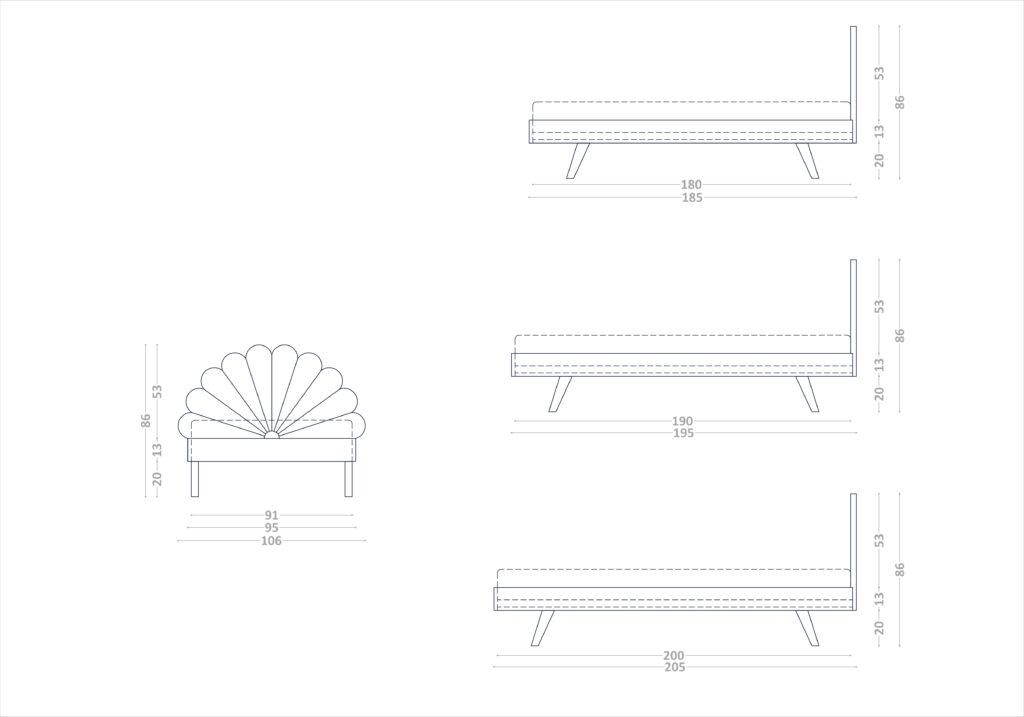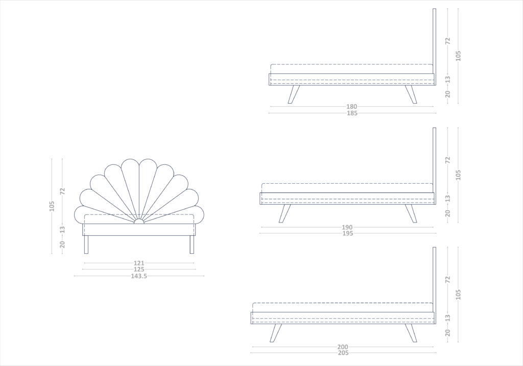 Łóżko z tapicerowanym zagłówkiem Feelings dostępne jest w pięciu rozmiarach dopasowanych pod materace o wymiarach: 90×200, 120×200 cm, 140x200cm, 160x200cm, 180x200cm, 200x200cm.