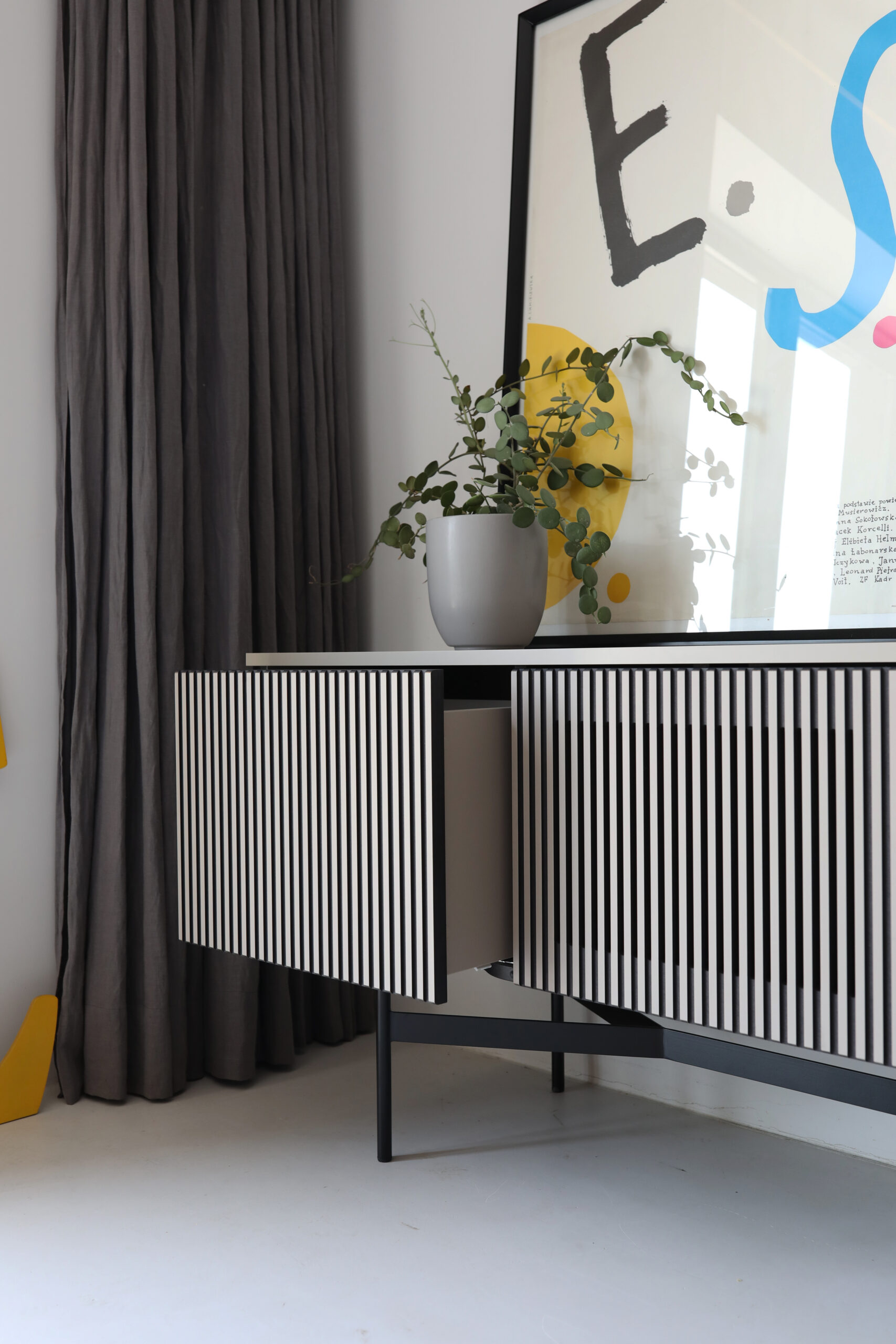 Fronty szafki RTV z cienkimi lamelami w kolorze czarnym nie tylko dają rewelacyjny wygląd, ale są też sprytnym rozwiązaniem, które pozwala na ukrycie sprzętu audio w szafce, bez utraty jakości połączenia z pilotem.