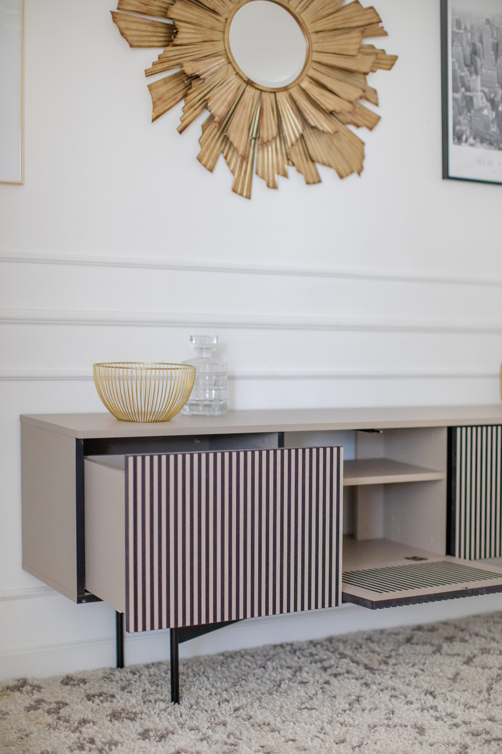 Rozwiązanie: *Spłyciliśmy dno mebla o około 5 cm i zostawiliśmy je otwarte w strategicznych miejscach, aby ukryć wszystkie kłopotliwe kable.