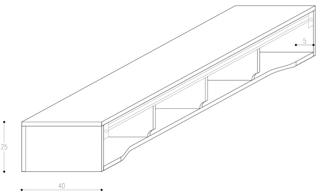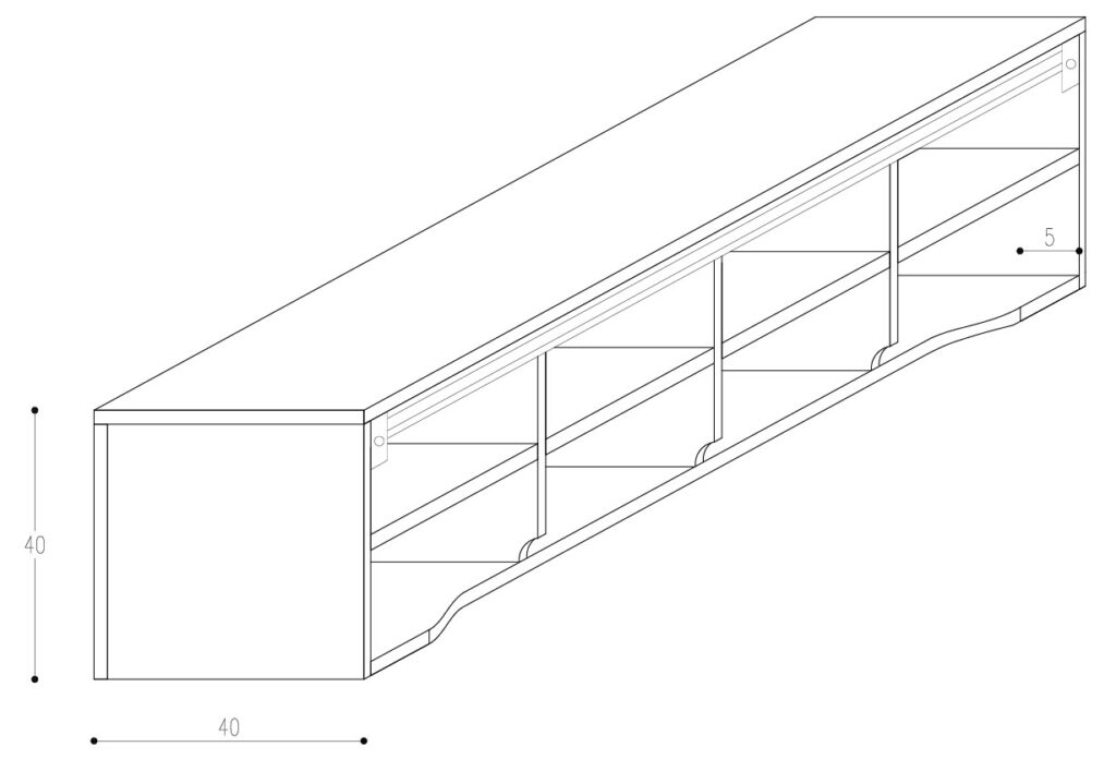 Rozwiązanie: *Spłyciliśmy dno mebla o około 5 cm i zostawiliśmy je otwarte w strategicznych miejscach, aby ukryć wszystkie kłopotliwe kable.