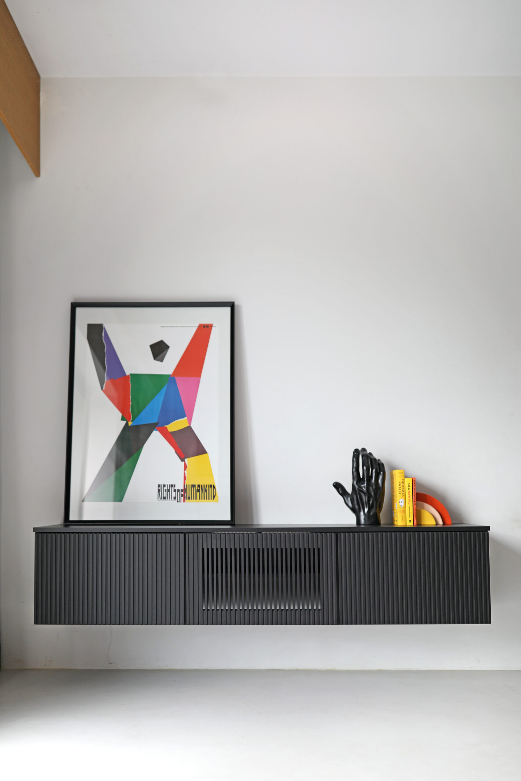 Rozwiązanie: Specjalnie opracowane, autorskie fronty z wertykalnymi otworami, które są ukryte pomiędzy lamelami. Takie elementy są bardzo estetyczne, a jednocześnie pozwalają na obsługę pilotem sprzętów znajdujących się w środku szafki. Koniec z kurzeniem się dekodera na blacie!
