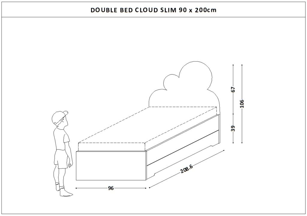 Łóżko ma tapicerowaną skrzynię i zagłówek w kształcie CHMURKI.