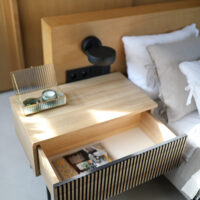 Nowoczesna szafka nocna LINE posiada jedną szufladę, otwieraną za pomocą podcięcia na palce. W naszej szafce zastosowaliśmy najwyższej jakości prowadnice dolne firmy BLUM, które są niewidoczne po jej otwarciu, a sama szuflada wysuwa się bezszelestnie i miękko domyka.