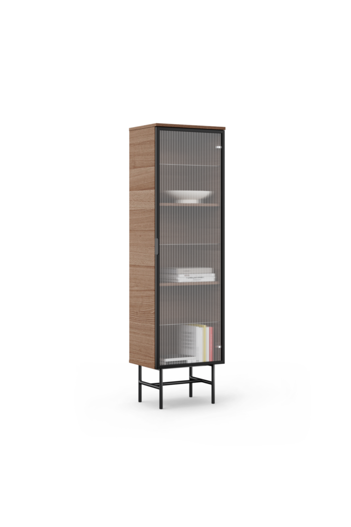 Szklana witryna GLASSY SKINNY została zaprojektowana z myślą o wymagających klientach, którzy poszukują unikalnych i trwałych mebli do swojego domu. Charakterystyczną cechą witryny jest półtransparentne, ryflowane szkło, zamknięte w aluminiową ramę. Karbowana powierzchnia szyby dodaje meblowi elegancji i nowoczesnego wymiaru. Kolor witryny możesz dowolnie spersonalizować, wybierając swój ulubiony odcień z naszej szerokiej oferty odcieni BASIC. Aluminiowa rama mebla wraz z uchwytami PLAIN dostępna jest w kolorze czarnym lub białym.